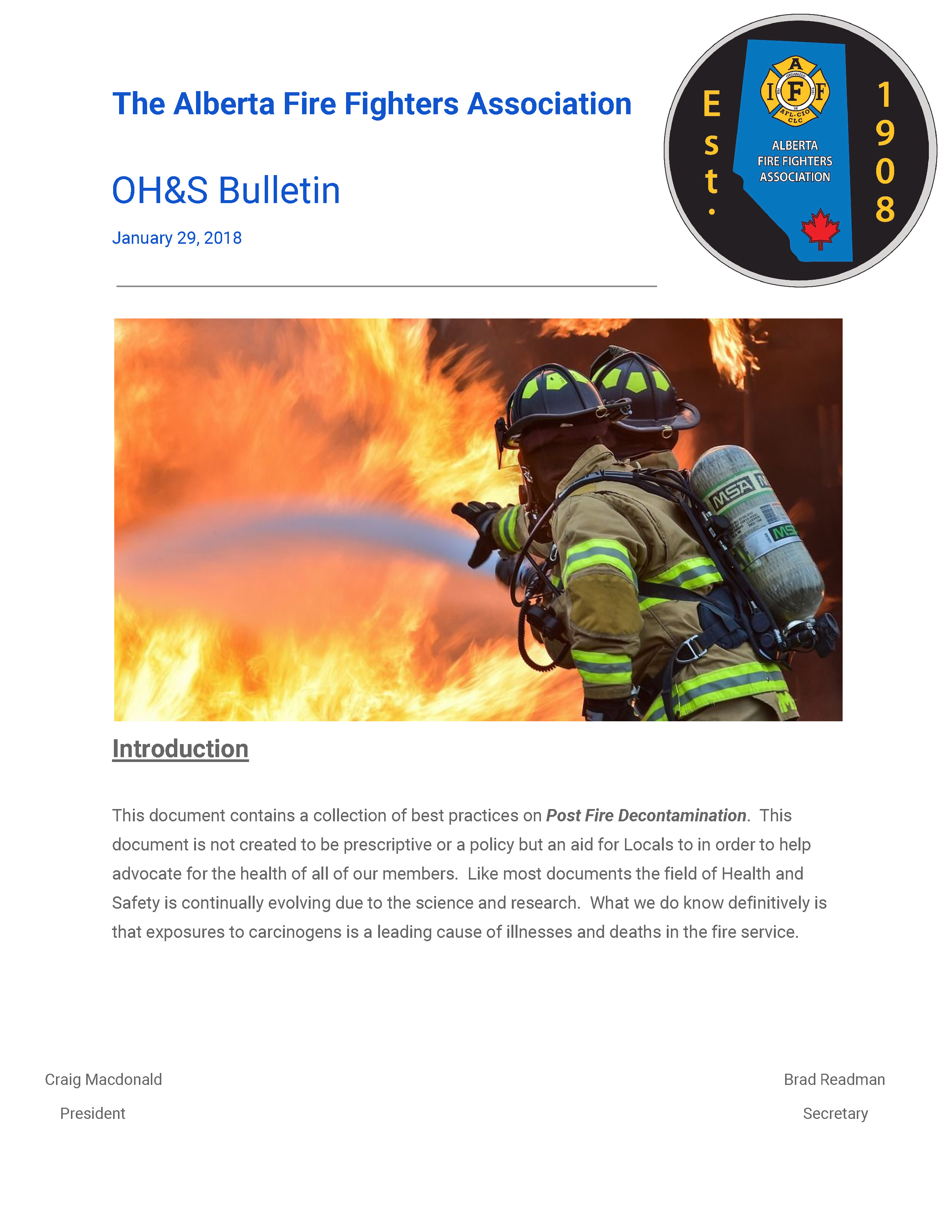 This document contains a collection of best practices on Post Fire Decontamination. This document is not created to be prescriptive or a policy but an aid for Locals to in order to help advocate for the health of all of our members. Like most documents the field of Health and Safety is continually evolving due to the science and research. What we do know definitively is that exposures to carcinogens is a leading cause of illnesses and deaths in the fire service.